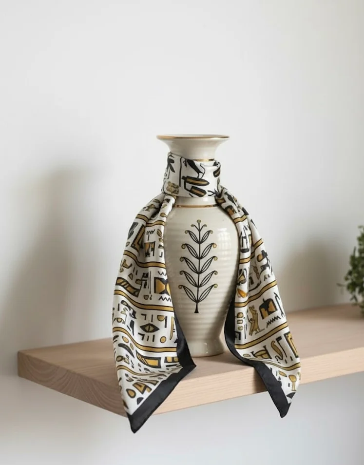 Fularını bir vazonun ya da cam şişenin etrafına bağlayarak küçük ama etkileyici bir detay yaratabilirsin. Bu, özellikle açık renkli mobilyalarda hem kontrast hem de yumuşaklık hissi verir.